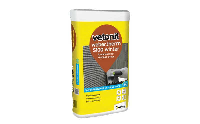 Клеевая смесь weber.therm S100 winter для монтажа пенополистирола и минеральной ваты и создания базового штукатурного слоя на поверхности теплоизоляции. Для работ при температуре от -10 до + 20 С